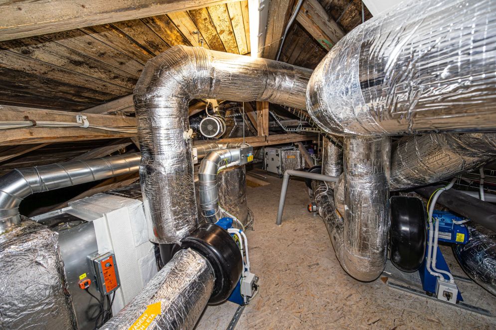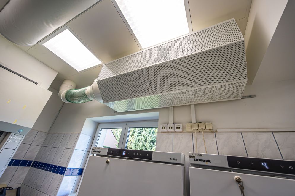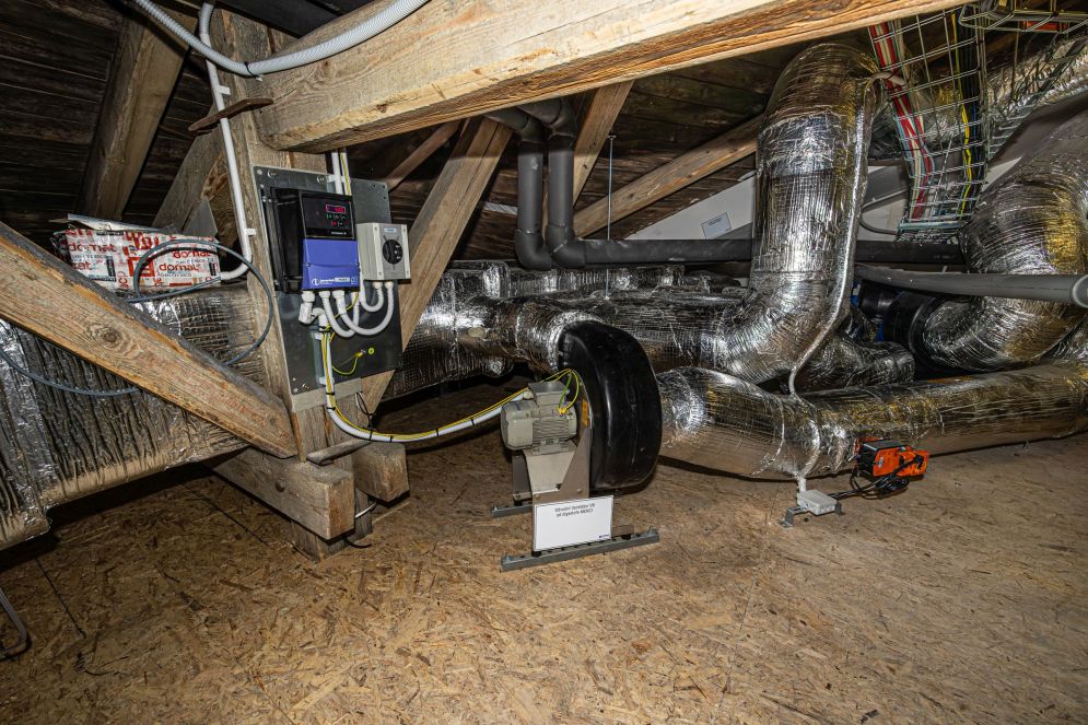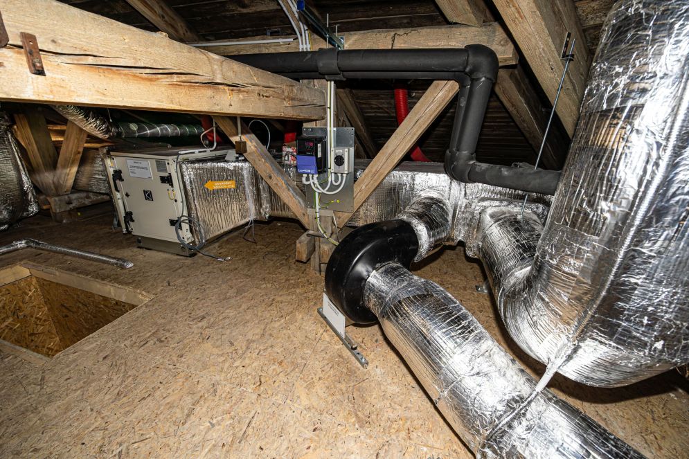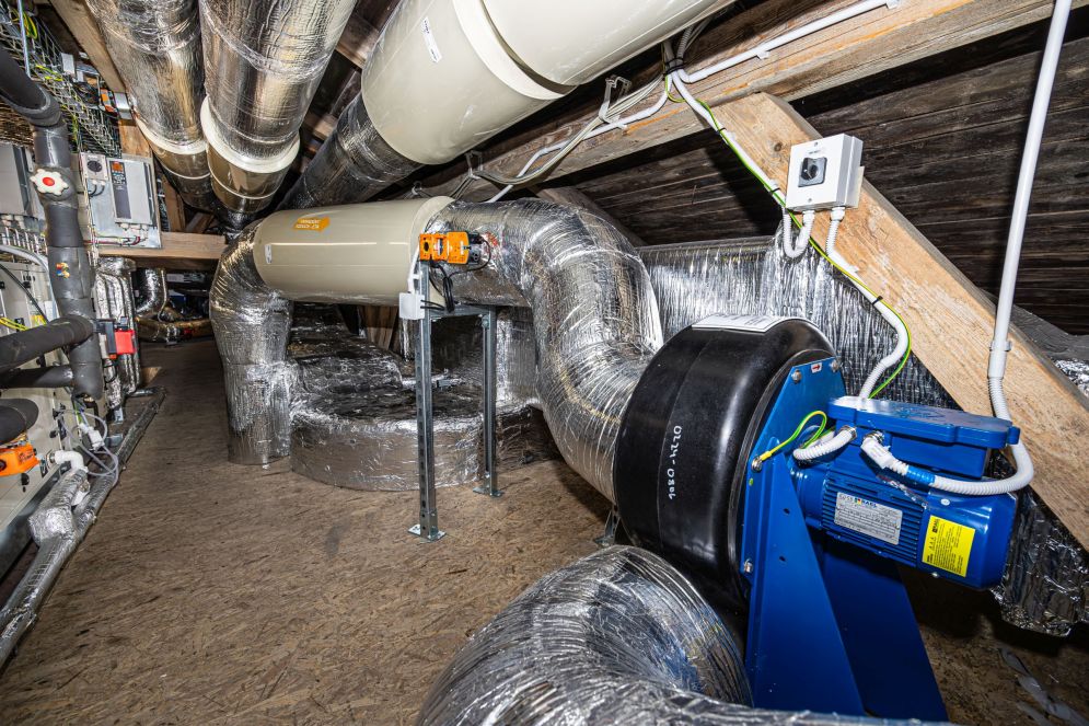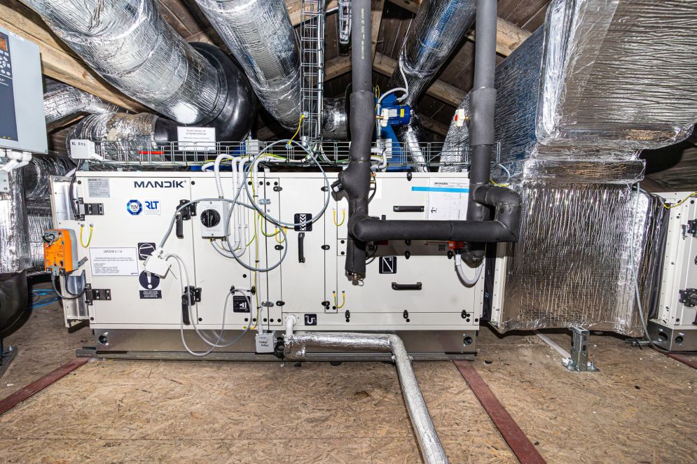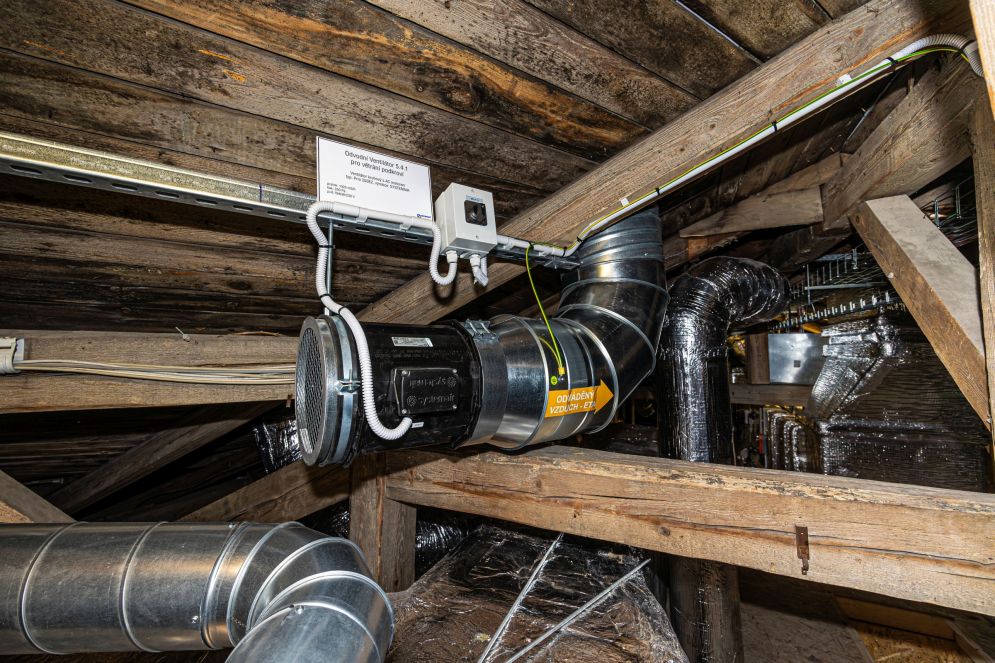 Nová vzduchotechnická jednotka s rekuperací tepla, adiabatickým zvlhčováním a dvoustupňovou filtrací byla rozdělena do čtyř částí a doplněna o nové odsávací ventilátory v EX provedení. Systém automaticky reaguje na počet spuštěných digestoří a umožňuje provoz i v tlumeném režimu.